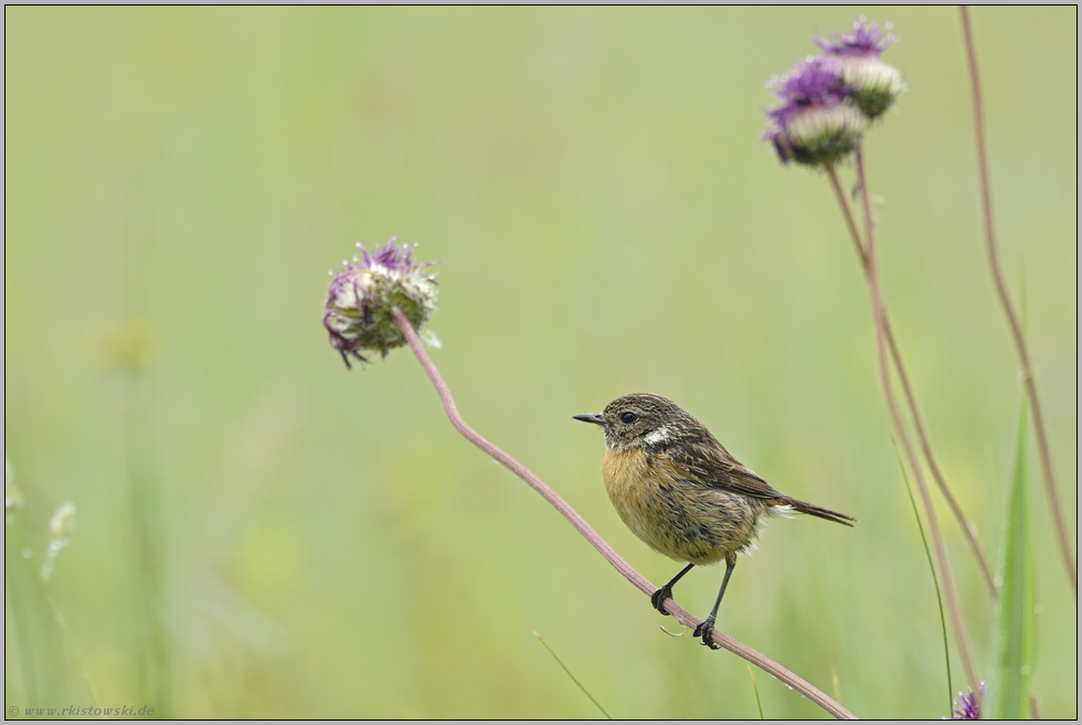 Das Weibchen des Schwarzkehlchens erscheint im Vergleich zu den Wiesenpflanzen klein und verletzlich. Tatsächlich werden die Vögel nur bis max. 12 cm lang und erreichen dabei ein Höchstgewicht von nur 10 bis 13 Gramm.